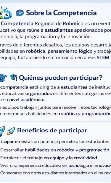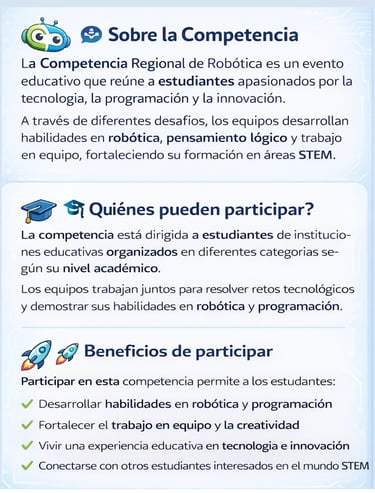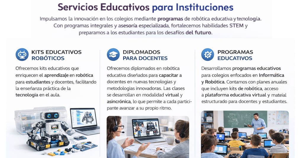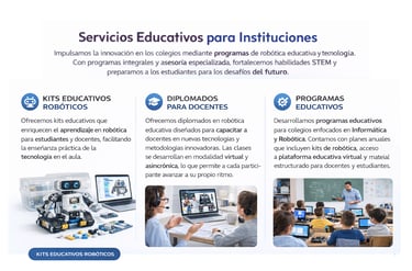 Desarrollamos el futuro de la educación a través de la robótica. Ofrecemos soluciones completas para colegios: desde planes de estudio innovadores hasta el apoyo en competencias y la capacitación de tus profesores. ¡Inspira a tus estudiantes con el poder de la tecnología!